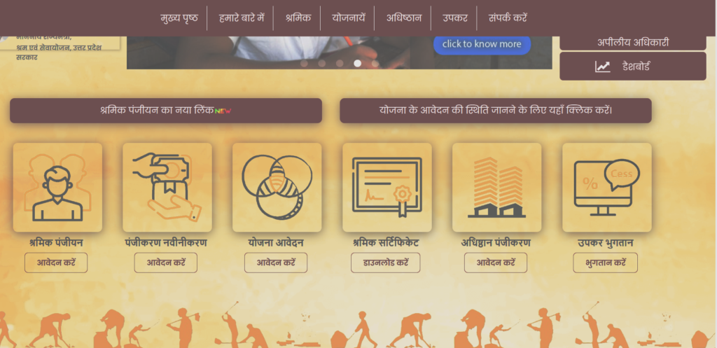 - जैसे ही आप उत्तर प्रदेश की लेबर कार्ड वेबसाइट को ओपन करेगें, उपर दिखाये गये स्क्रीनशाट के अनुसार आपके सामने वबसाइट ओपन होगी।